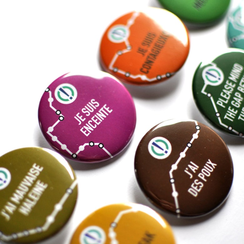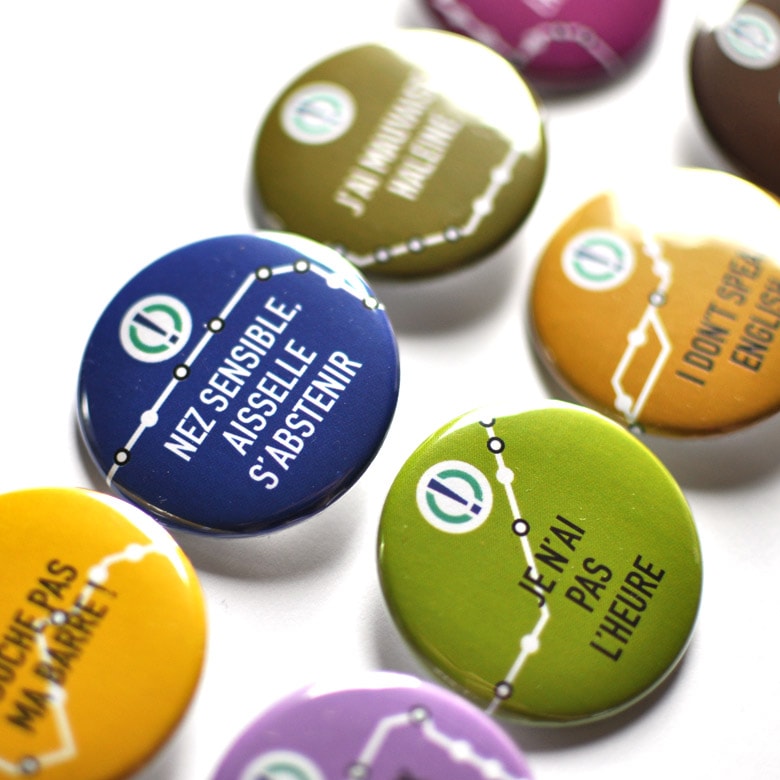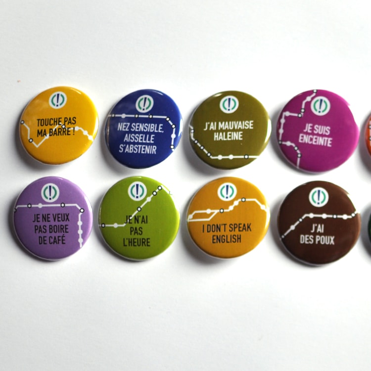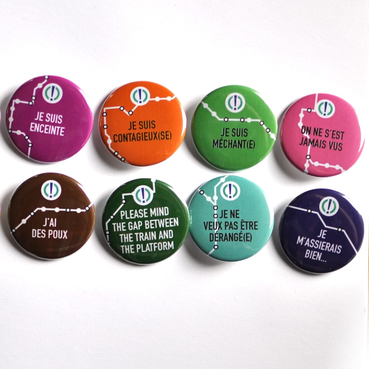 Nouvelle série de badges rigolos parce qu’on a tous souffert de la mauvaise haleine du grand roux de la ligne 13, de la main qui glisse subrepticement sur la barre pour effleurer la sienne, du gros lourd qui profite des problèmes électriques pour tester ses techniques de drague et j’en passe !