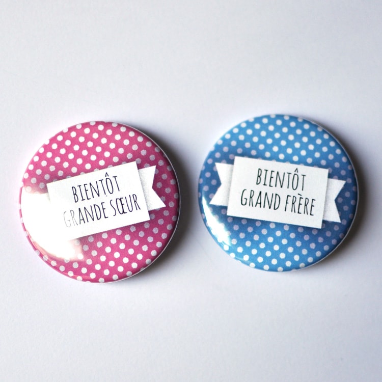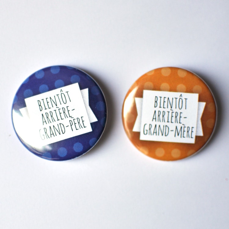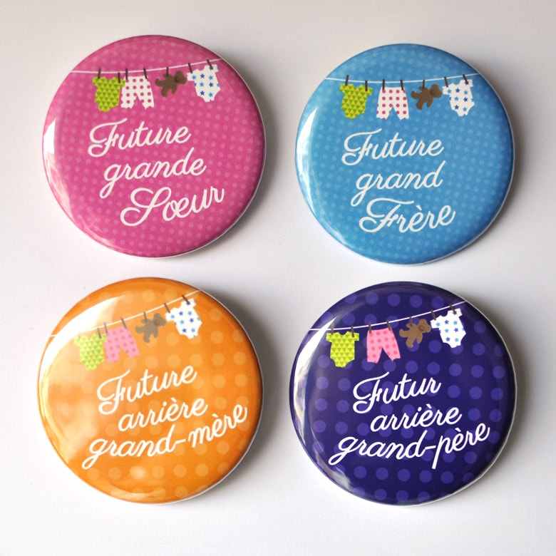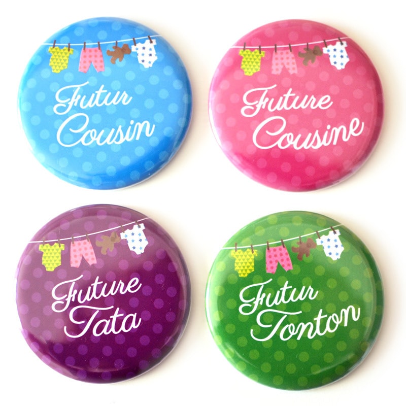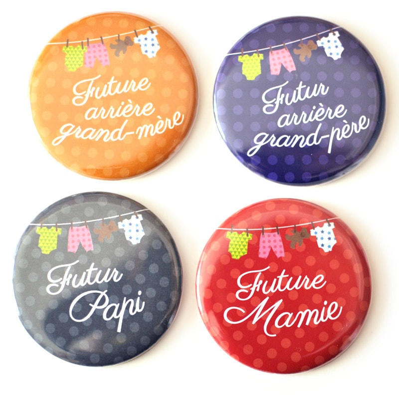 Badges ou magnets personnalisés pour chacun(e). Future mamie, futur papi, future tata, futur tonton, etc. Il y en a pour toute la famille, même pour les parrains / marraines.