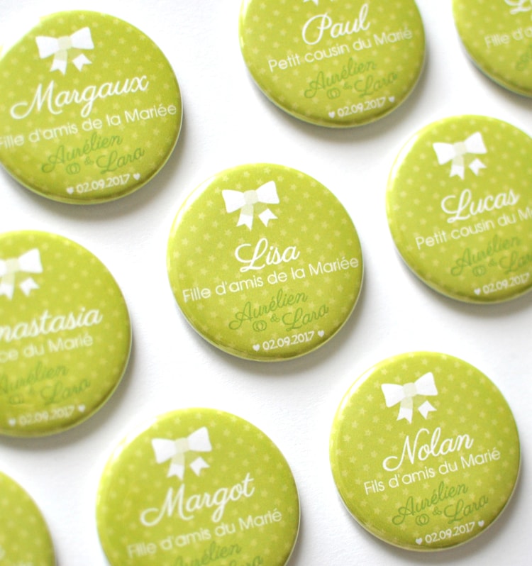 Je ne propose pas encore de badges vêtements magnétiques, mais la future mariée a été très ingénieuse. Astuce : elle m’a commandé des magnets 38 mm, et elle a commandé en parallèle des mini aimants sur Amazon. Et hop, elle avait ses badges aimantés, que les invités on pu mettre sur leur frigo une fois la fête passée !