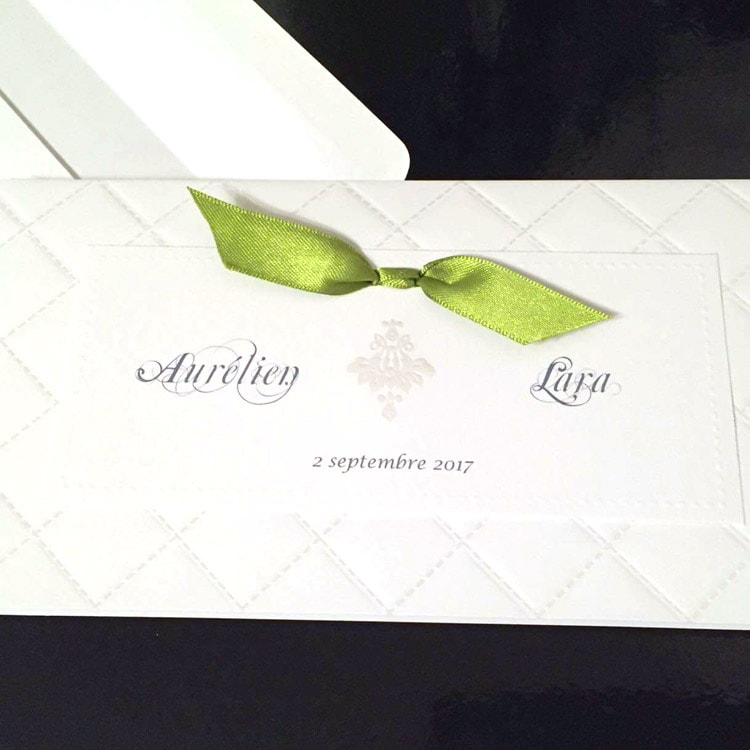 Un visuel rafraîchissant pour un mariage estival ! Lara m’a envoyé son faire-part et simplement demandé un modèle correspondant à son thème vert anis, avec : le prénom l’invité, son lien avec le ou la mariée, les prénoms des mariés la et date du mariage. Deux-trois échanges plus tard, la photo des robes de demoiselles d’honneur envoyée pour assurer le coup, et nous avions le vert par-fait !