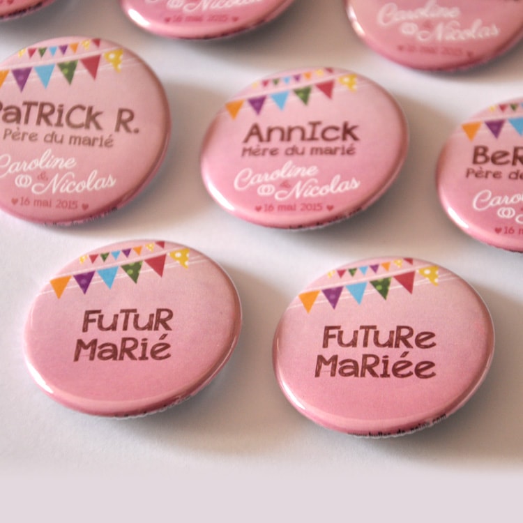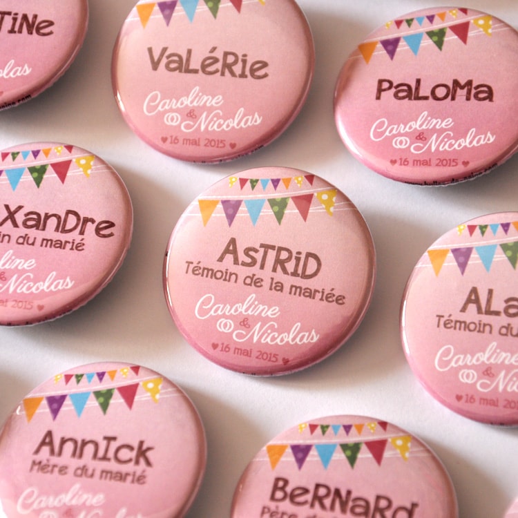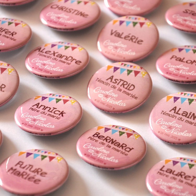 Badges nominatifs réalisés pour le mariage de Caroline et Nicolas. Thème joyeux fanions et fête foraine. Modèles spéciaux réalisés pour les témoins et parents des mariés.