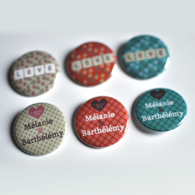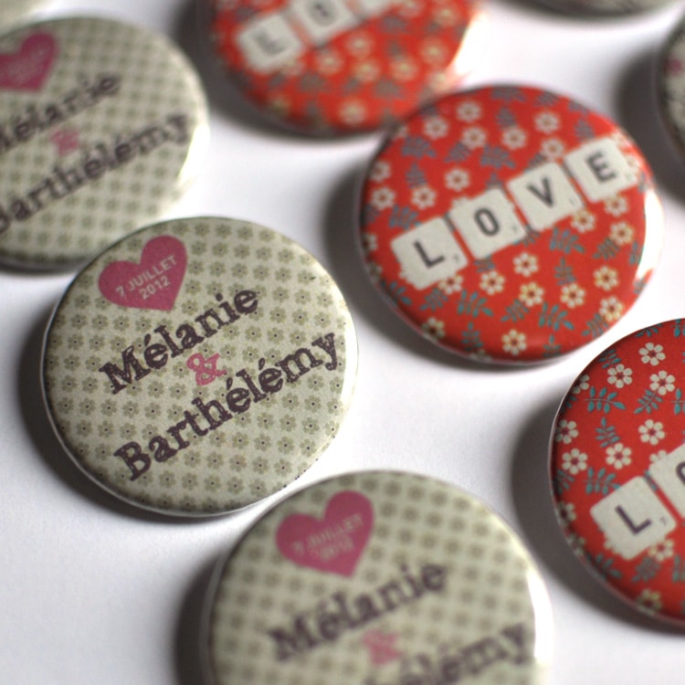 Voici une nouvelle série de badges X + Y = Amour (wou les amoureux !) qui vont être distribués prochainement aux chanceux invités du mariage de Mélanie et Barthélémy. Imprimés Liberty fleuris aux couleurs du faire-part et de la fête. Vive les mariés !