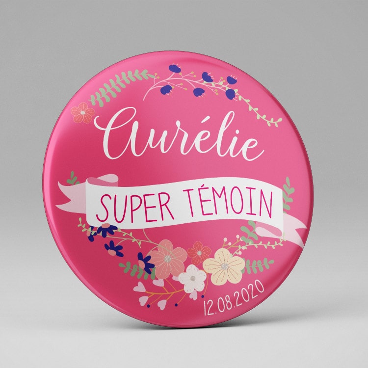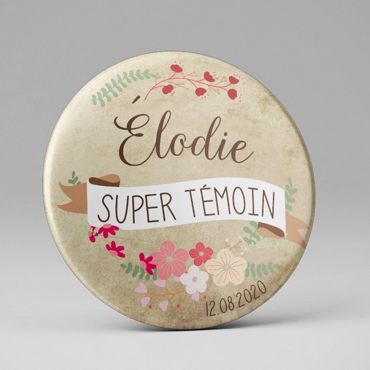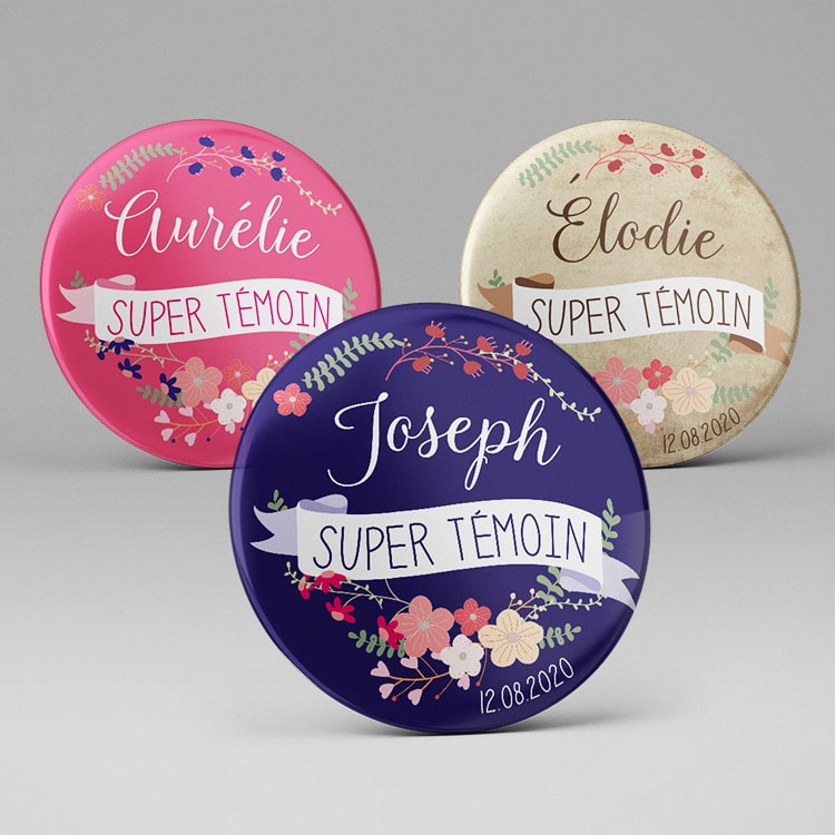 Des objets joliment décorés par une couronne de fleurs bucolique, à offrir d’urgence à vos témoins chéris ! Qu’ils soient aimant, pins, décapsuleurs ou miroirs, ils comportent le prénom de l’heureux témoin et la date du mariage. ❤