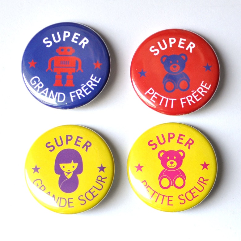 Série de 4 badges enfants « Super petit / grand frère », « Super petite / grande sœur », à offrir à la naissance d’un nouveau bébé par exemple.