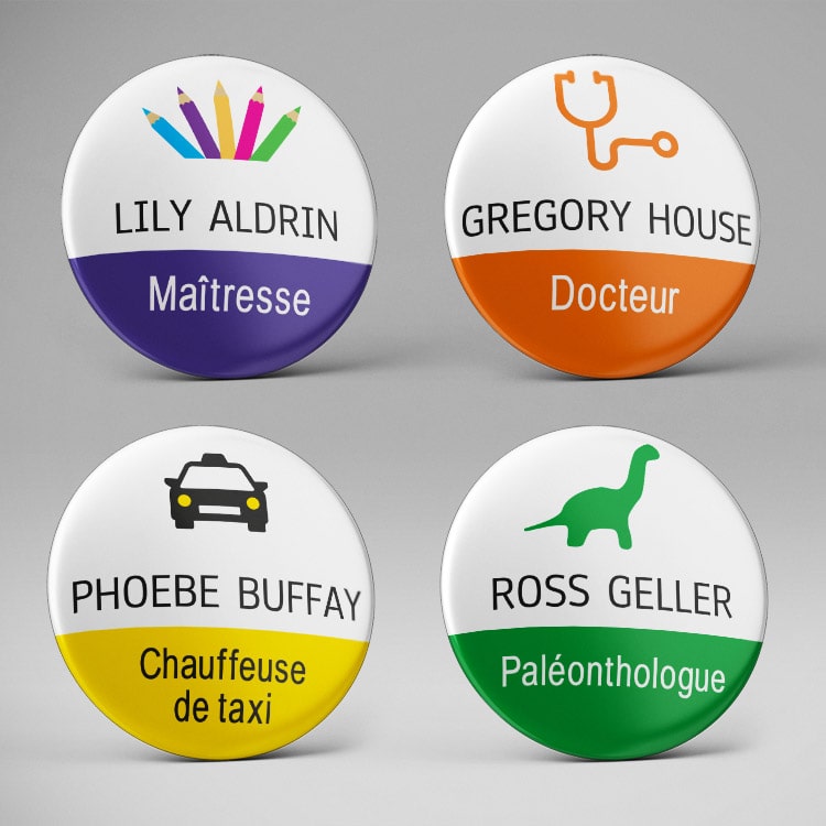 Badges ou magnets personnalisés, pour afficher fièrement ses nom, prénom et métier : docteur, maîtresse, infirmière, ATSEM, puéricultrice, sage-femme, etc.