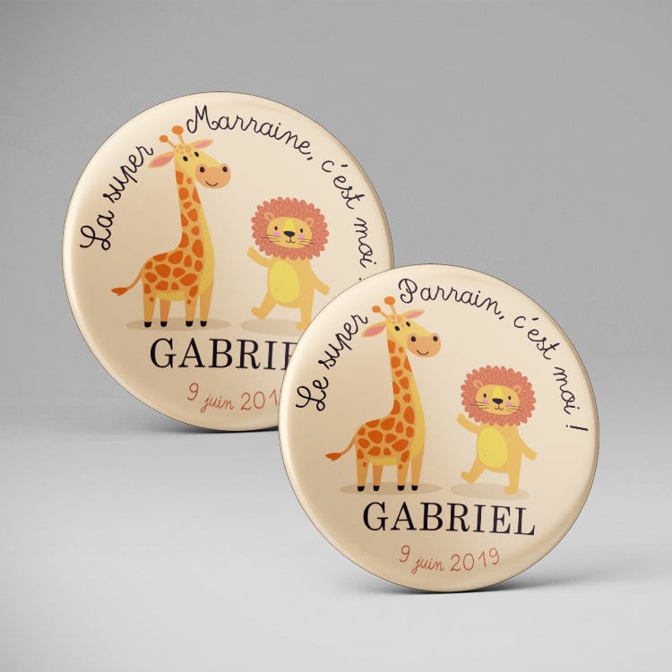 Des magnets à offrir en souvenir aux invités du baptême. Lion et girafe pour coller à un thème savane. Badges et magnets Super Parrain / marraine en vente également.